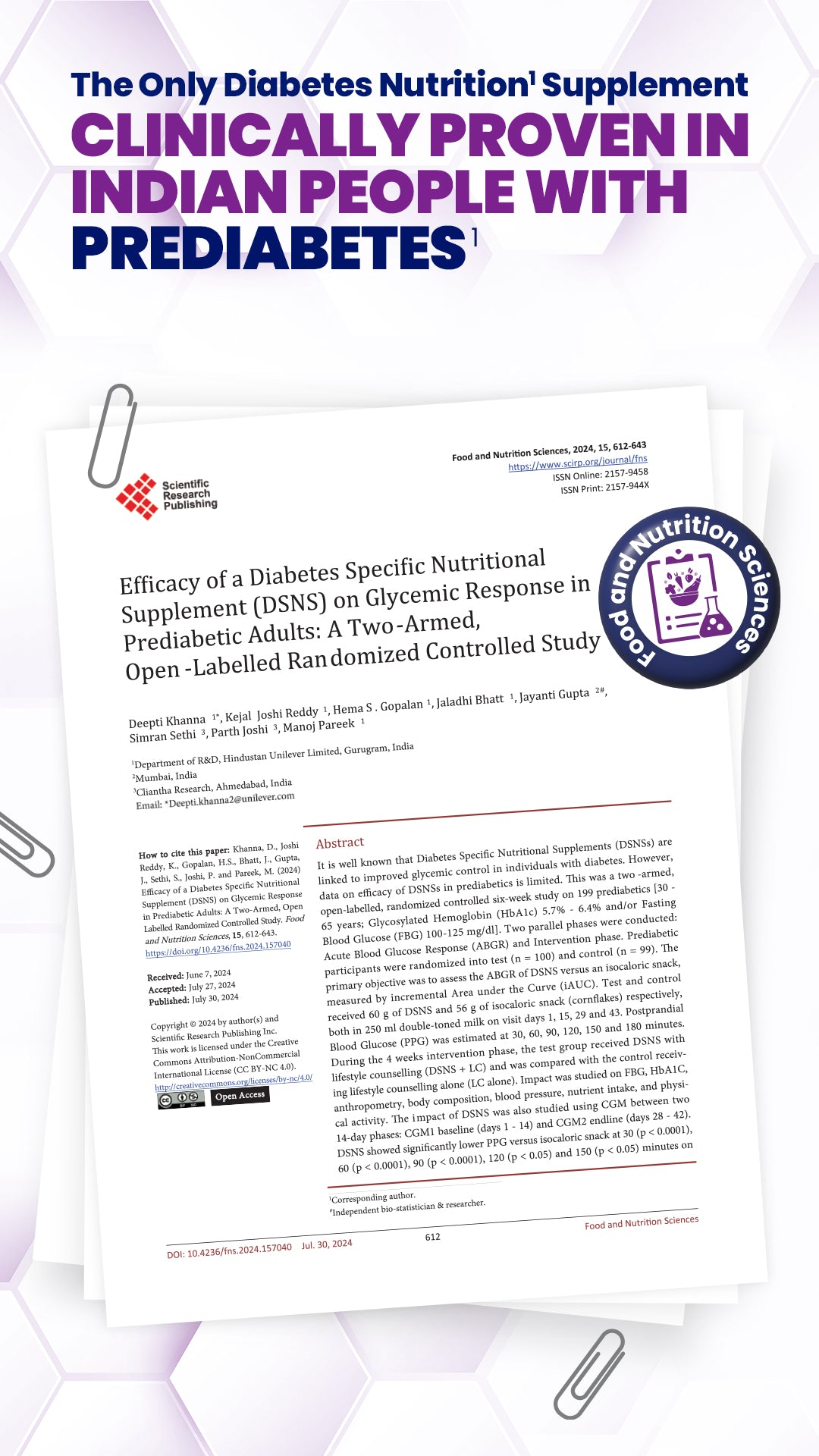 Efficacy of a Diabetes Specific Nutritional Supplement (DSNS) on Glycemic Response in Prediabetic Adults: A Two-Armed, Open-Labelled Randomized Controlled Study